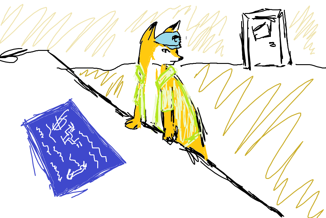 Рисунок выглядит так, как будто его нарисовал ребёнок: штрихи неровные, некоторые участки закрашены не полностью, другие оставлены белыми. За лисом видна закрытая дверь.
