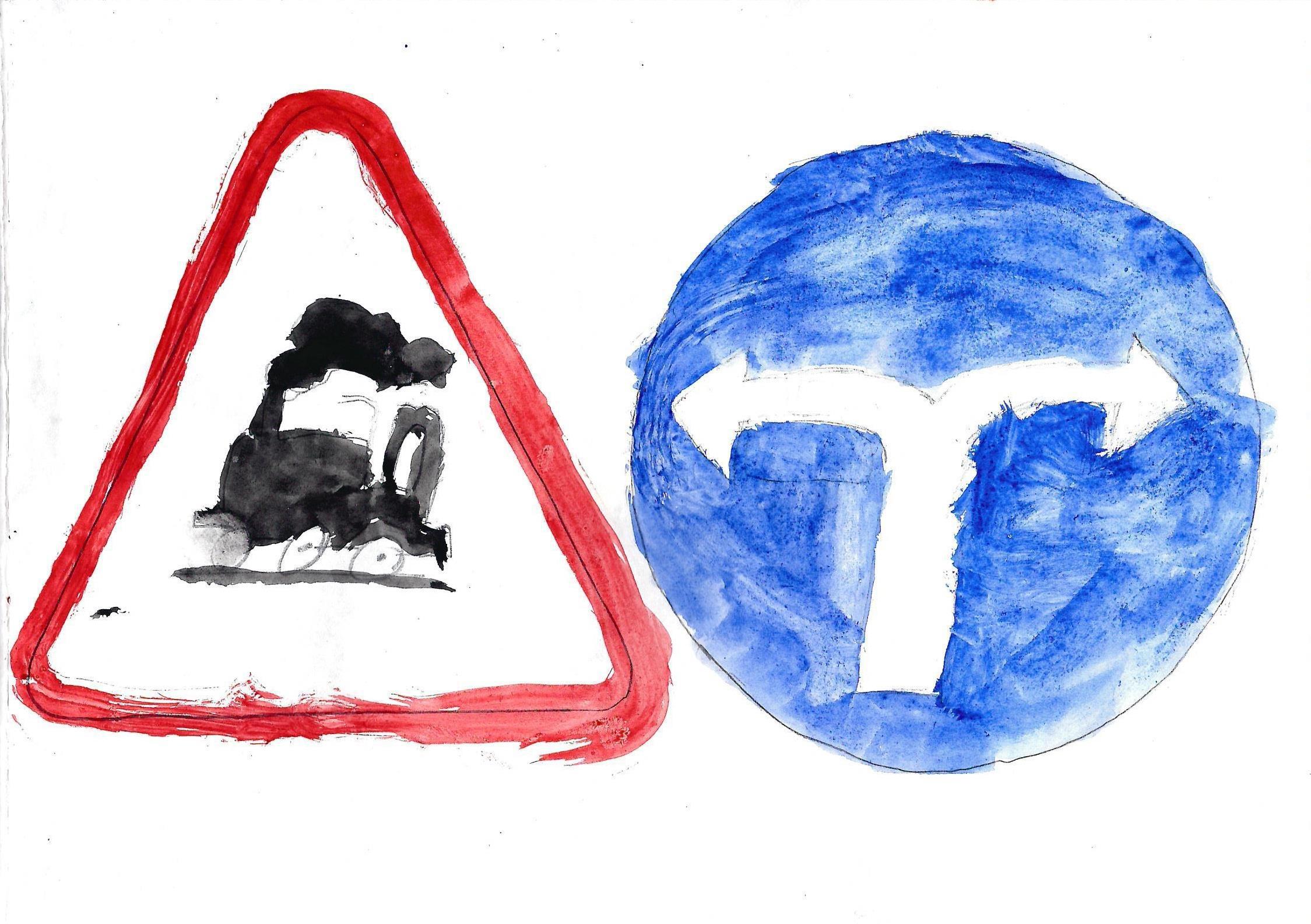 На рисунке Маринетт Мортен изображены два дорожных знака. Один из них – треугольный, белого цвета с красным обрамлением, в центре которого нарисован паровоз, выпускающий клубы дыма. Другой знак – круглой формы, полностью синего цвета, на котором из одной линии образуются две стрелки, направленные в разные стороны: одна вправо, другая влево.