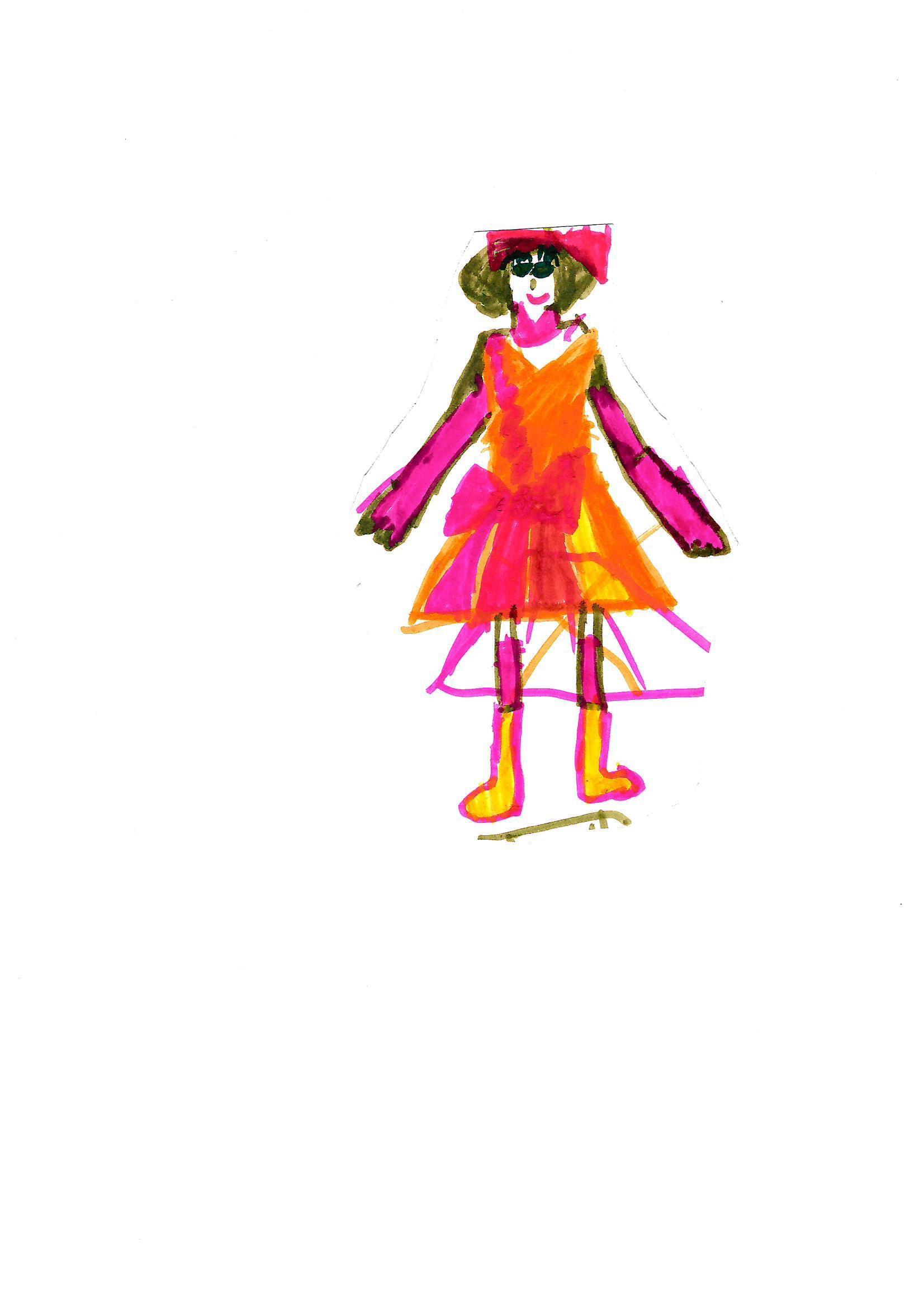 На рисунке Маринетт Мортем изображена девочка, возможно она изобразила саму себя, так как у нее были яркие наряды, в том числе ярко-розовые куртко-пальто. Девочка на рисунке предстает перед нами в образе яркой модницы.