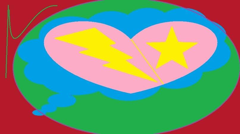 Произведение искусства художницы Маринетт Мортем "Сердце на всяком фоне" представляет собой яркую и выразительную композицию. На фоне синего неба с облаками расположено растянутое по ширине розовое сердце. Внутри сердца находятся две основные фигуры: желтая молния и желтая пятиконечная звезда, соединенные тонкой желтой полосой.