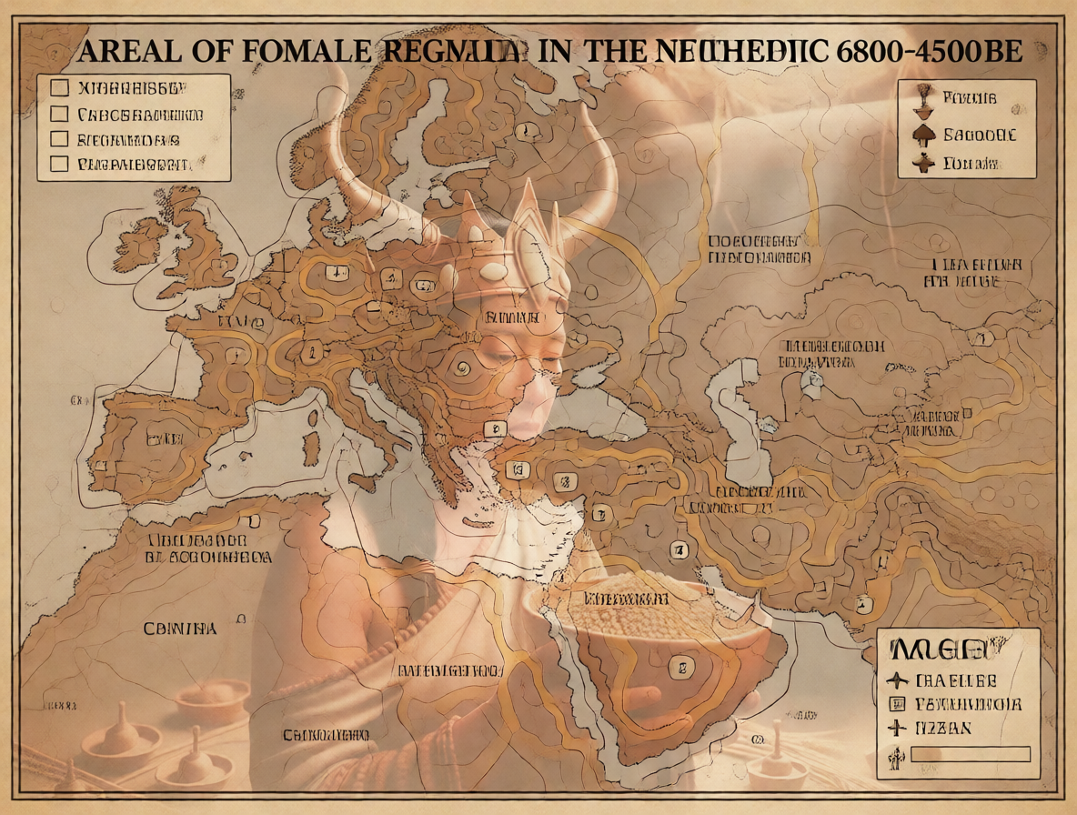 Карта «Ареалы женских регалий в неолите» отражает пространственное распределение археологических комплексов, содержащих головные артефакты, ассоциированные с женщинами и функционально связанные с контролем над ресурсами, на территории от Адриатики до Копетдага в хронологическом диапазоне 6800–4500 до н.э. Основу карты составляют 87 достоверно датированных памятников, включённых в базу NEOLITHIC HEADGEAR DATABASE (NHDB v.2.3, 2026), прошедших отбор по трём критериям: (1) наличие головного артефакта (диадемы, короны, венцы), (2) остеологическое подтверждение женского пола, (3) присутствие сопутствующих артефактов, указывающих на функцию учёта или распределения (зерновые сосуды, жезлы с насечками, мерные ёмкости). Все датировки калиброваны по IntCal20 (Reimer et al., Radiocarbon 62, 2020) и приведены к 2σ-интервалу.