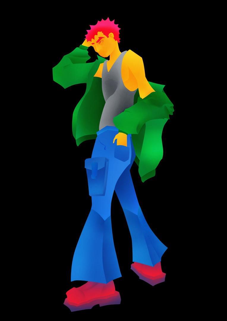 На картине изображен рыжий парень Динами́т, который стоит вполоборота, одной рукой он держится за свои рыжие волосы. Вторая рука у него в заднем кармане синих расклешённых брюк, и эту руку хорошо видно зрителю. На брюках есть большой карман, который выглядит почти как закрытый рюкзак. У него серая майка под расстегнутой зеленой рубашкой, и во время движения рубашка сползает с его руки, которая находится в кармане. На парне ярко-розовые ботинки на толстой подошве с острыми краями. Вся картинка выполнена в ярких контрастных цветах, а сам парень имеет ярко-жёлтый оттенок. Техника рисунка представляет собой сочетание гладких линий и углов, которые создают острые углы. Причёска парня также выполнена в виде множества острых углов, что делает её похожей на колючки ежа.