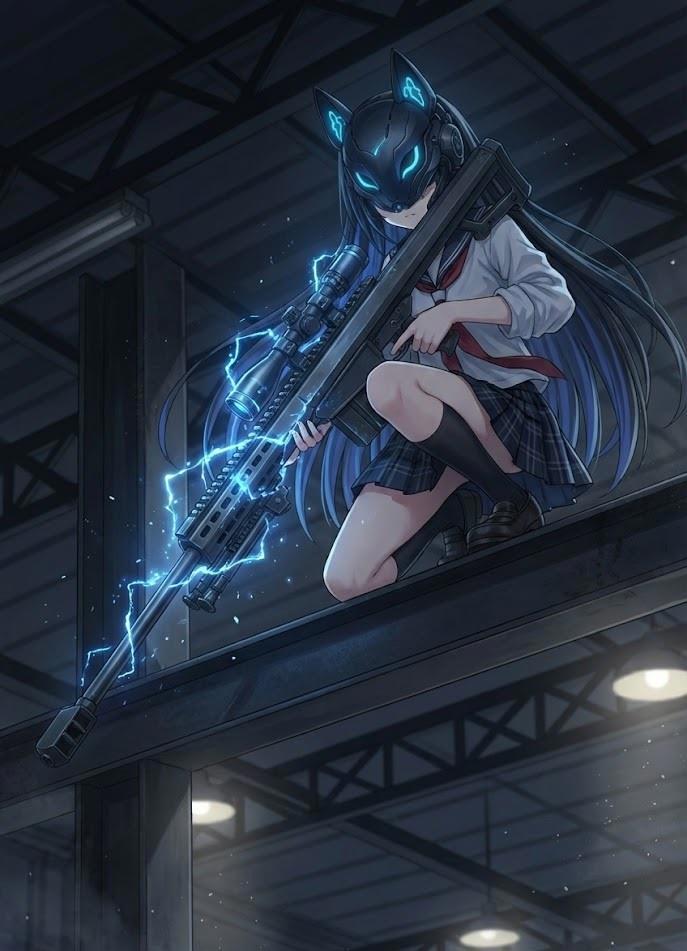 На крыше мелькнула тень. Силуэт спрыгнул вниз — метров двадцать свободного падения. Нормальный человек превратился бы в мешок с костями. Но этот приземлился мягко, спружинив ногами, и тут же выпрямился. Школьная форма. Юбка в клетку, белая рубашка, сбившийся галстук. На лице — стилизованная маска лисы, скрывающая всё, кроме горящих голубых глаз. В руках — монструозная снайперская винтовка, которая выглядела слишком большой для такой хрупкой фигурки.