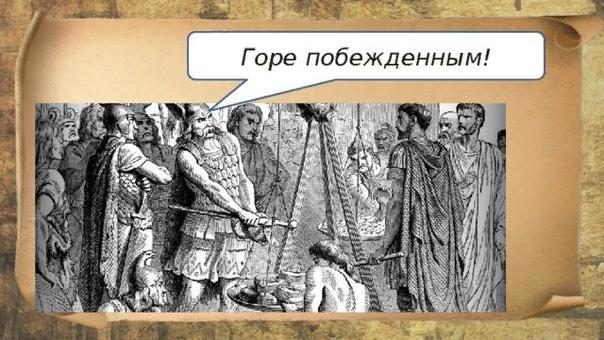 Когда-то эти петухи [галлы переводятся именно так, ничего иного наш римский друг не имел ввиду] даже захватили величайшую из столиц, и показали знаменитую варварскую честь. После договора о выплате контрибуции, римляне заметили, что галлусы обманывают при взвешивании римского золота. Когда же горожане обратились к Бренну, вожаку захватчиков за справедливостью, тот посмеявшись бросил на свою чашу весов меч: "Горе побеждённым". Этот урок латиняне выучат на долго.