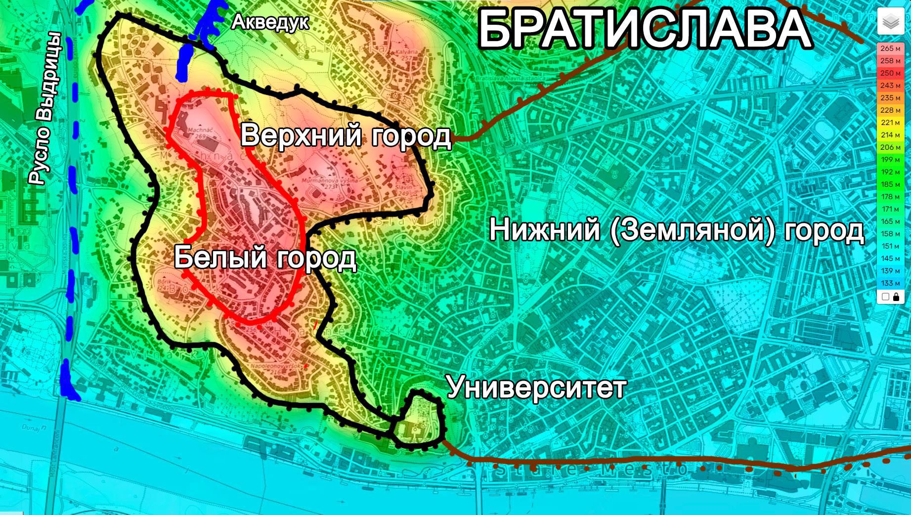 И в конце обзор с высоты птичьего полета современной Братиславы. Обратите внимание на то, как укреплен "Градец". Так по идее будет укреплен весь периметр возвышенности, что виднеются слева от него.