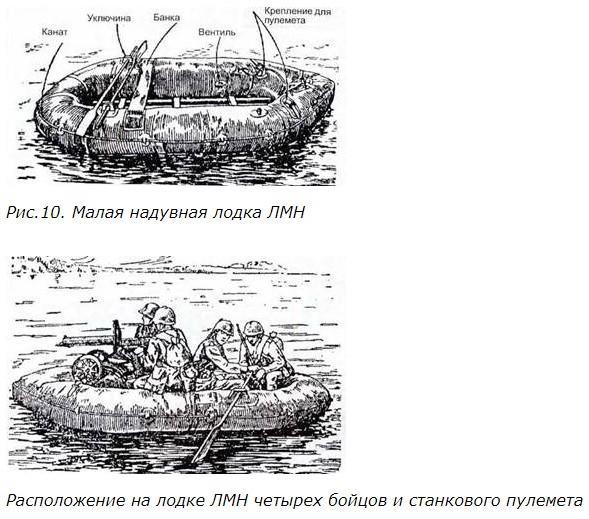 Малая надувная лодка (ЛМН) предназначалась для ведения инженерной разведки и обслуживания работ при переправе через водные преграды: связь, спасательные команды и др. (рис. 10). Снаряженная лодка имела размеры:длину – 3,2 м, ширину – 1,25 м, высоту – 0,4 м и весила около 43 кг. В комплект лодки входили: лодка, днище, три весла, ножной мех, шланг для надувания лодки, чехол к лодке, манжеты (для весел), мешочек для хранения запасных частей.
