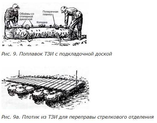 Труднозатопляемое переправочное имущество (ТЗИ), при простоте обращения, отличали быстрота сборки конструкции и труднозатопляемость от ружейно-пулеметного огня противника (рис. 9, 9а). В комплект ТЗИ входило 32 поплавка, 32 подкладочных доски, 16 звеньев и перильных досок с уключинами. Поплавок ТЗИ представлял собой изготовленный из прочной ткани мешок (3,0 х 0,5 х 0,3 м.), пропитанный водонепроницаемым составом, набиваемый труднозатопляемым материалом (ТЗМ): сердцевиной подсолнуха, пушком кендыря, пушком ласточника, а также сеном, соломой, сухой хвоей, стружками и др. К днищу поплавка были пришиты четыре брезентовых ремня для крепления к поплавку подкладочной доски. Вес оболочки поплавка был 6,7 кг, в набитом состоянии – 30- 40 кг, полезная грузоподъемность – 250 кг. Из имущества ТЗИ собирались плоты, мосты различной конфигурации, позволяющие переправлять от одиночного бойца до пехоты в колонне по два, 76- мм орудия, груженой двуколки весом до 800 кг, повозки весом до 1000 кг и другие средства.