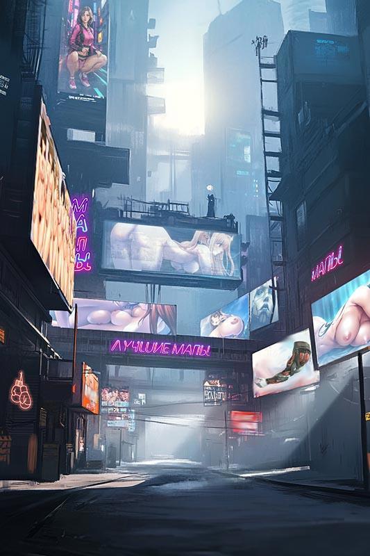Если сами эстакады строились в момент наивысшего расцвета, то торговые ряды на них выросли, как плесень на падали. Город проиграл битву за своё будущее, хотя в тот момент казалось, что мы ещё подёргаемся. Большие надежды возлагались на ренд-систему, которая должна была в моменте вытянуть промышленность из задницы. Плановое конвейерное воспроизводство казалось способом восстановить численность населения, возместив потери от Чёрного Тумана. Новые технологии, завезённые Креоном вместе с их носителями, обещали рывок с выходом на новый уровень жизни для всех. С видеоэкранов транслировали надежду, сетевые новости рисовали перспективы, но Средка с её коммерческой интуицией оказалась права — с тех пор город то быстрее, то медленнее катился вниз. Поэтому торговые ряды, клубы, бордели, дансинги и прочие заведения здесь представляют собой комбинации дешёвых стандартных модулей, закреплённых на полотне не нужных больше подвесных шоссе. Узкие проезды между ними стали новыми улицами и переулками, которых вполне достаточно для подвоза товаров, и только средняя линия, вдоль которой расположены самые дорогие заведения, более-менее широкая. Там катаются те, у кого есть токи на машины и моты, там гуляют первые недели после ренда, когда счёт полон, а жизнь прекрасна, там самая яркая реклама, самая громкая музыка и самые высокие цены. Средка-в-Средке.