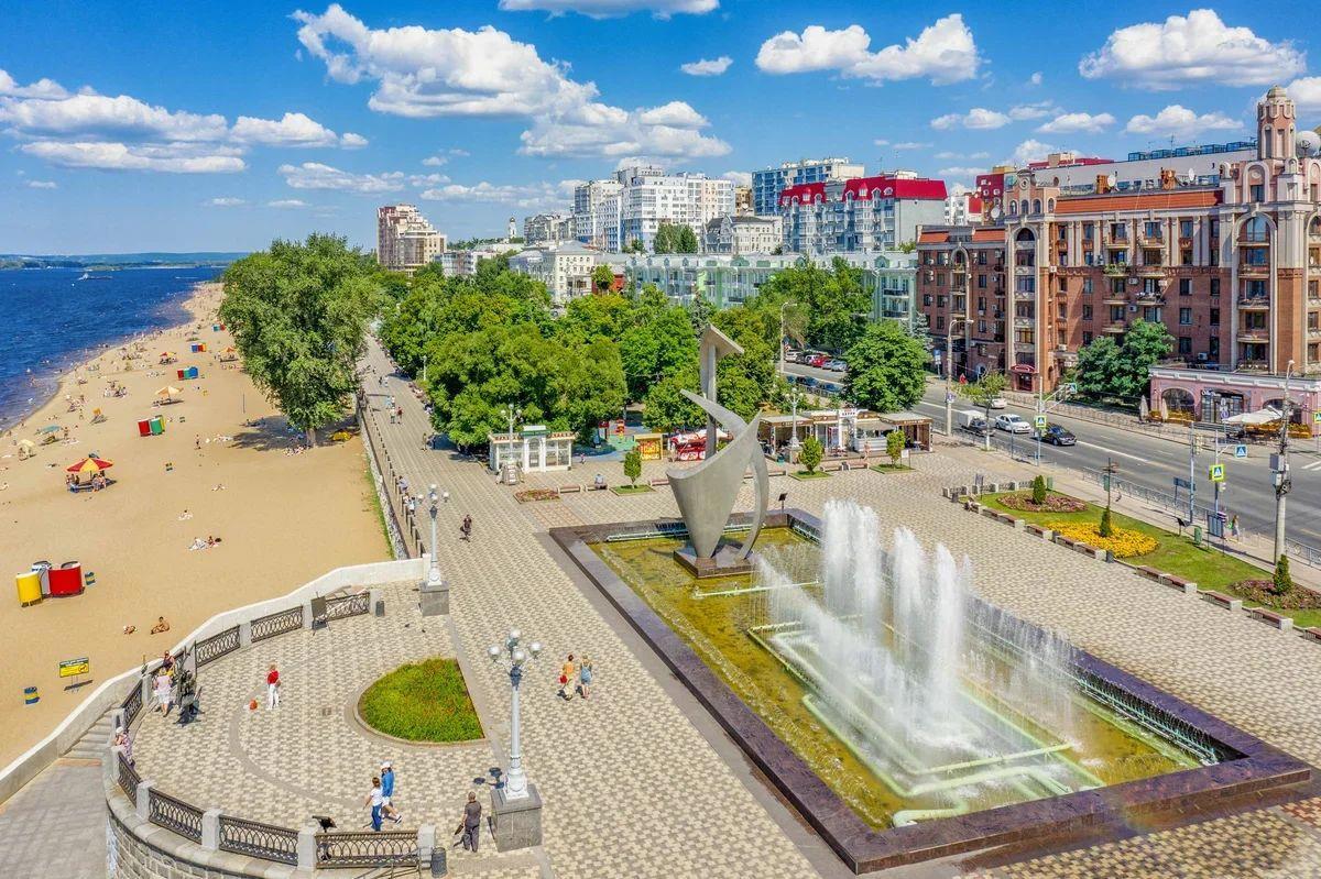 4. САМАРСКАЯ НАБЕРЕЖНАЯ. Она просторными террасами спускается к Волге, включает в себя песчаный пляж и пешеходно-прогулочную зону. Её называют лучшей в России, а иные – даже в мире. Длина набережной около 5 км, и она постоянно продлевается. Каждую весну обновляется песчаный пляж, благоустраивается вся набережная и прилегающая территория. На мой взгляд набережная особенно хороша в своём начале и у стелы «Ладья» с комплексом высоких оригинальных зданий «У Ладьи».