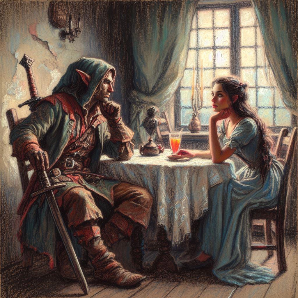 Абхилагаша, переломив себя, наложила маскировку и даже подобие одежды, прикидываясь молодой ларитрой. Напротив нее же сидел некто, похожий на бродягу, в старом выцветшем плаще и с шпагой в потертых ножнах. Остроконечные уши и мощное телосложение выдавали в нем сида, но одежда говорила о сиде-изгое, отверженном ренегате, зарабатывающем клинком.