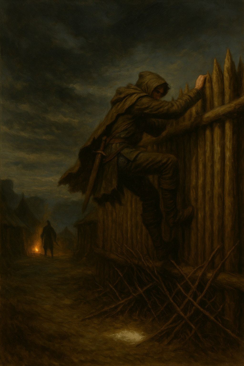 Последняя преграда — деревянная стена с колючими ветками внизу, возведённая наспех. Караульный проходил вдоль неё с факелом, не ожидая ничего необычного.
