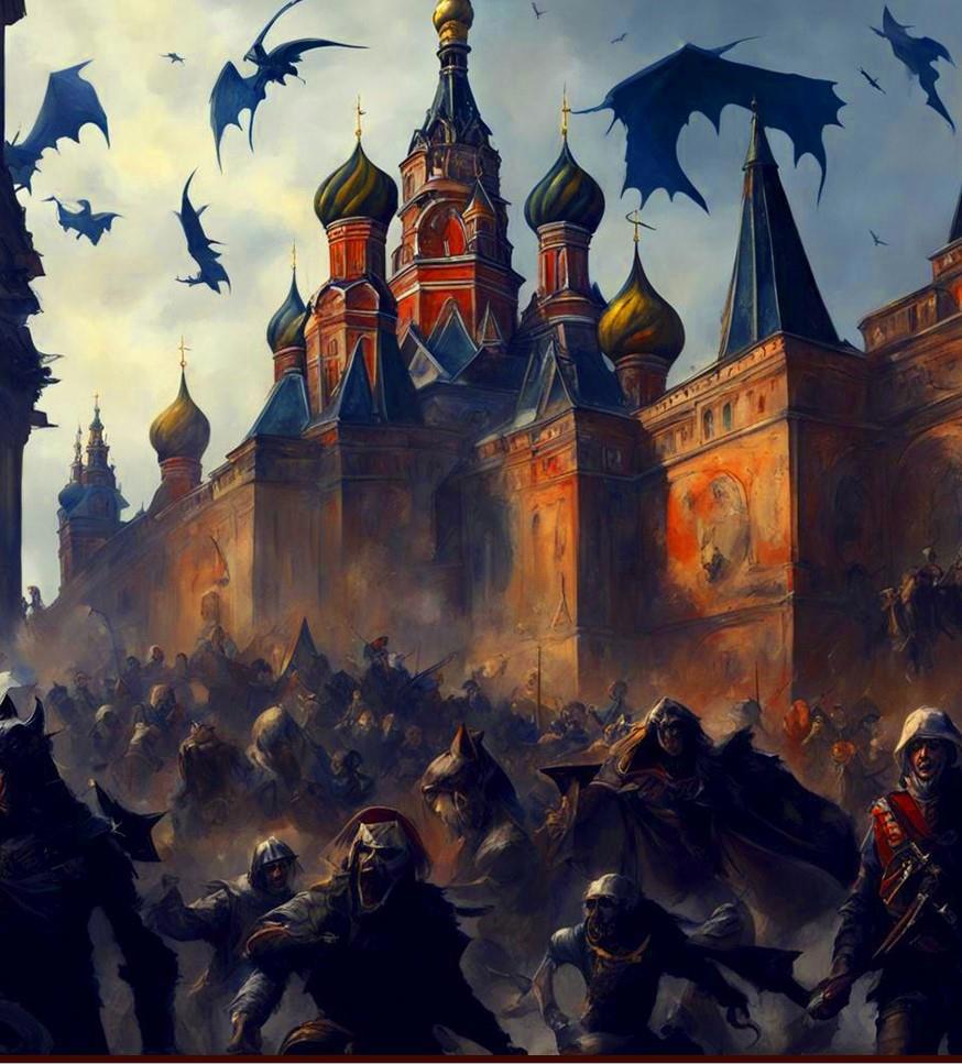 Сшибка! Свалка! Яростное побоище! Кровавая баня! И по всему московскому горизонту уже сверкали магические молнии и его застилал дым сполохов повсюду взрывающихся файерболов. Могучие «воздушные кулаки» и тараны, каждый из которых был способен разом снести пол-Москвы, безжалостно рушили замки и башни великих древних крепостей. Свирепые удары длинными мечами, разрубающие тела в железных латах, и повдоль, и поперёк и, даже, наискосок. Копья, стрелы, без счёта, тучами, торчали отовсюду. Отрубленные пальцы, головы, руки и ноги ковром устилали брусчатку Красной Площади. Беззвучно ржали и вставали на дыбы боевые кони! Кровь лилась рекой!