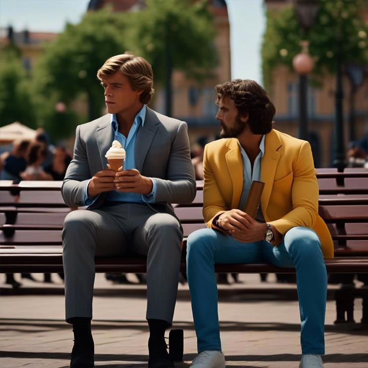 И что? Да ничего! Хотя… А кто это там у нас с такой знакомой наружностью, темноволосый красавец, в джинсиках, в модном жёлтом пиджачке, стоял в очереди за мороженым и глазами на меня зыркал - подзову, не подзову? Конечно, подзову! - Эй-й, мне пломбир в вафельном стаканчике возьми, да?!