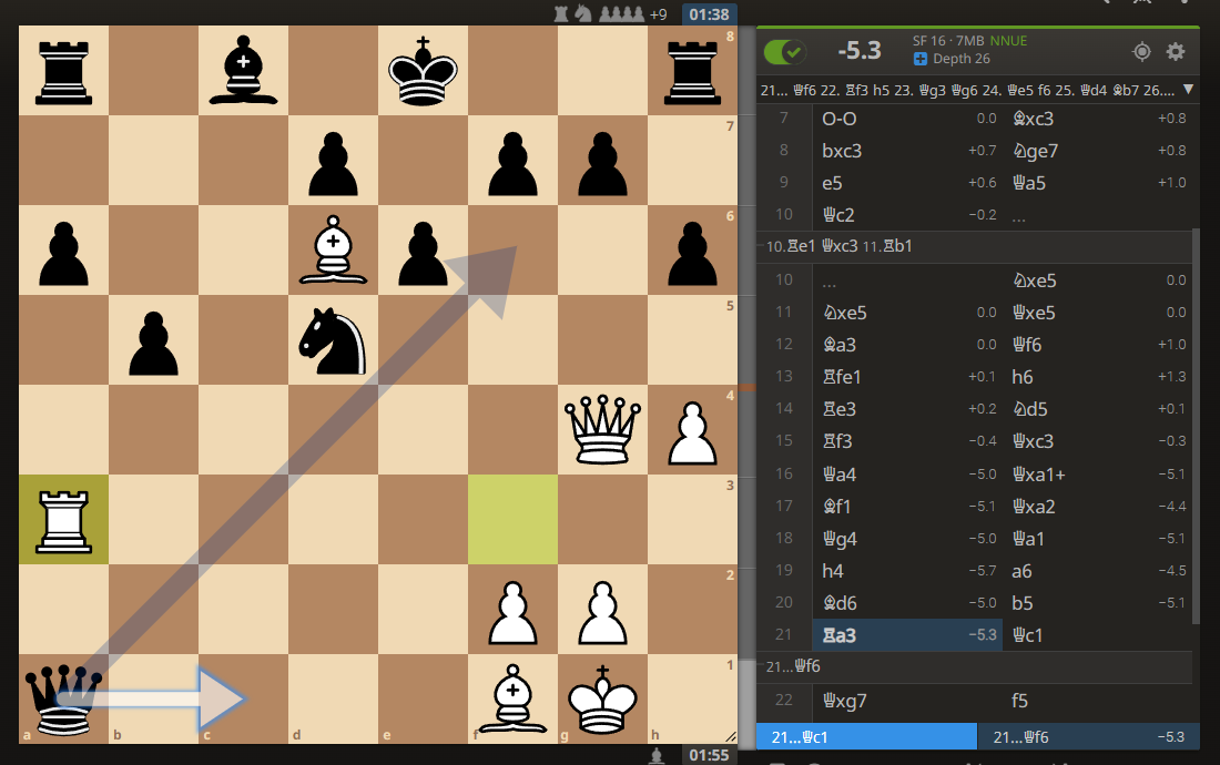 Соперник тут надолго (секунд на 20) задумался над ходом. Я заметил, что на любой разумный отход черного ферзя, например, 21. ... Фb2 или 21. ... Фf6 у белых нет никаких перспективных идей.