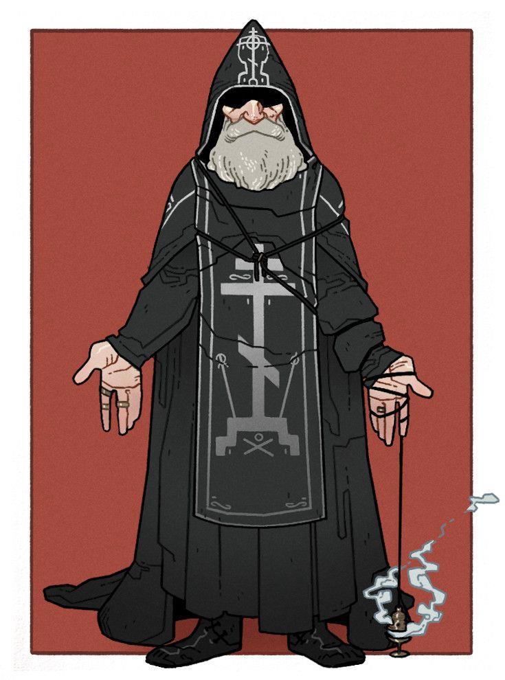 - Борода седая, глаза огнём из-под капюшона горят. На одежде кресты какие-то серебром нарисованы. Словно на кладбище.