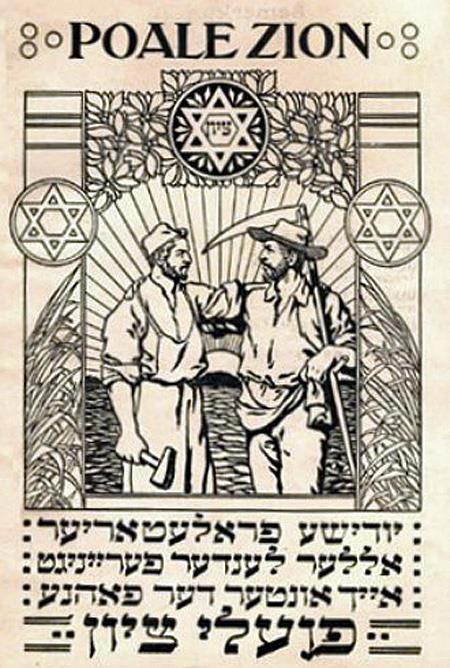 Плакат организации "Поалей Цион"(Рабочие Сиона) - социал-демократической ветви "палестинофильского" движения. Впоследствии организация распалась на тех, кто считал создание еврейского государства основной задачей, и сторонников идеи о том, что главное - борьба за интересы еврейских трудящихся вне Земли Обетованной.