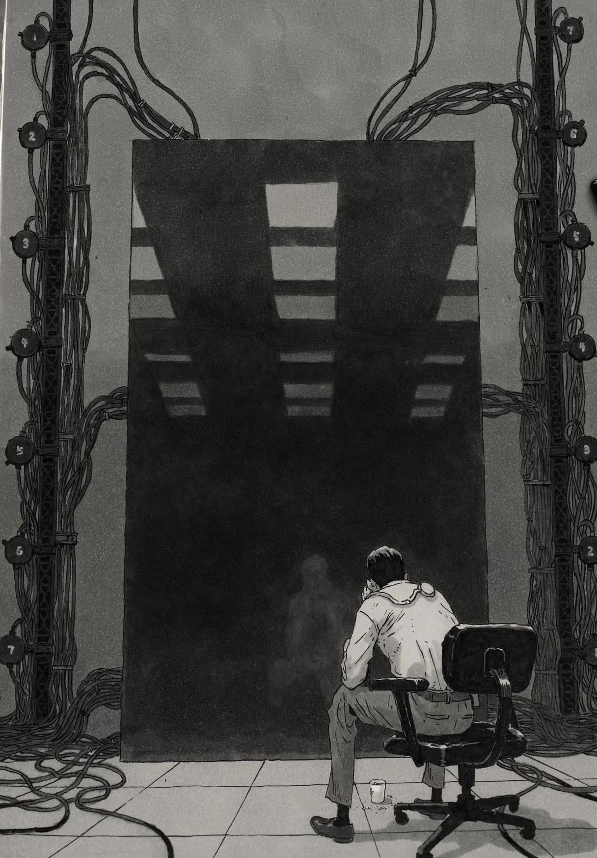 Сколько времени прошло — неизвестно. Я открыл глаза, обнаружив себя сидящим в простом компьютерном кресле. Вокруг царила абсолютная пустота. Огромная, без единого предмета, комната. Лишь на четырёх стенах, от пола до потолка, висели огромные чёрные зеркала, их идеально гладкие поверхности отражали лишь самих себя и густую паутину проводов, соединявшихся между собой. Опять зеркала подумал я. В центре комнаты, на идеально чистом полу, стоял единственный предмет — стакан с водой. Тишина. Глубокая, давящая тишина, поглощающая всё вокруг. Она была настолько абсолютной, что казалось, даже собственное дыхание нарушало её хрупкое равновесие.