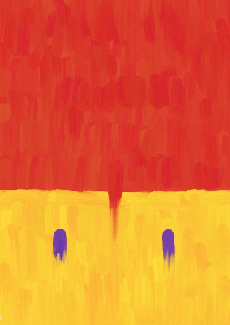 Картину можно описать как сочетание нескольких геометрических форм: в пропорциях 12 к 8 сверху картину наполняет красно-оранжевый фон, а снизу желтый. С красного фона в центре идет мазок вниз, разбивающий картину на 2 части по вертикали. И в этих двух симметричных областях, на желтом фоне, прямо по центру разделенных областей есть два фиолетовых мазка вниз. Эти мазки по чуть выше центра симметрии по вертикали. Вся картина выполнена мазками сверху вниз, то есть художница не выполняла заливку областей цветом, а прорисовывала вручную каждый мазок. Это делает произведение искусства современной художницы Маринетт Мортем ценным и востребованным.