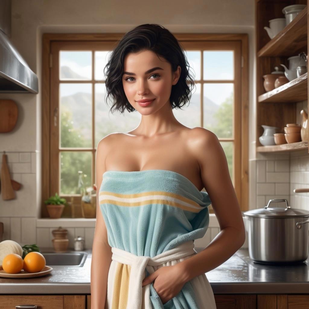 Но разве можно так? Вышла из ванной, закутавшись в одно полотенце! Нет, все интересные места оно закрывало… Умудрилась спрятать свои прелести не пряча, а наоборот подчёркивая. Полная грудь, обтянутая махрой, колыхалась в такт её плавной походке, а уж бёдра… Подойдя ко мне вплотную обдала запахом влажного тела и парфюма. Забрала лопатку и жестом указала, чтоб проваливал от плиты.