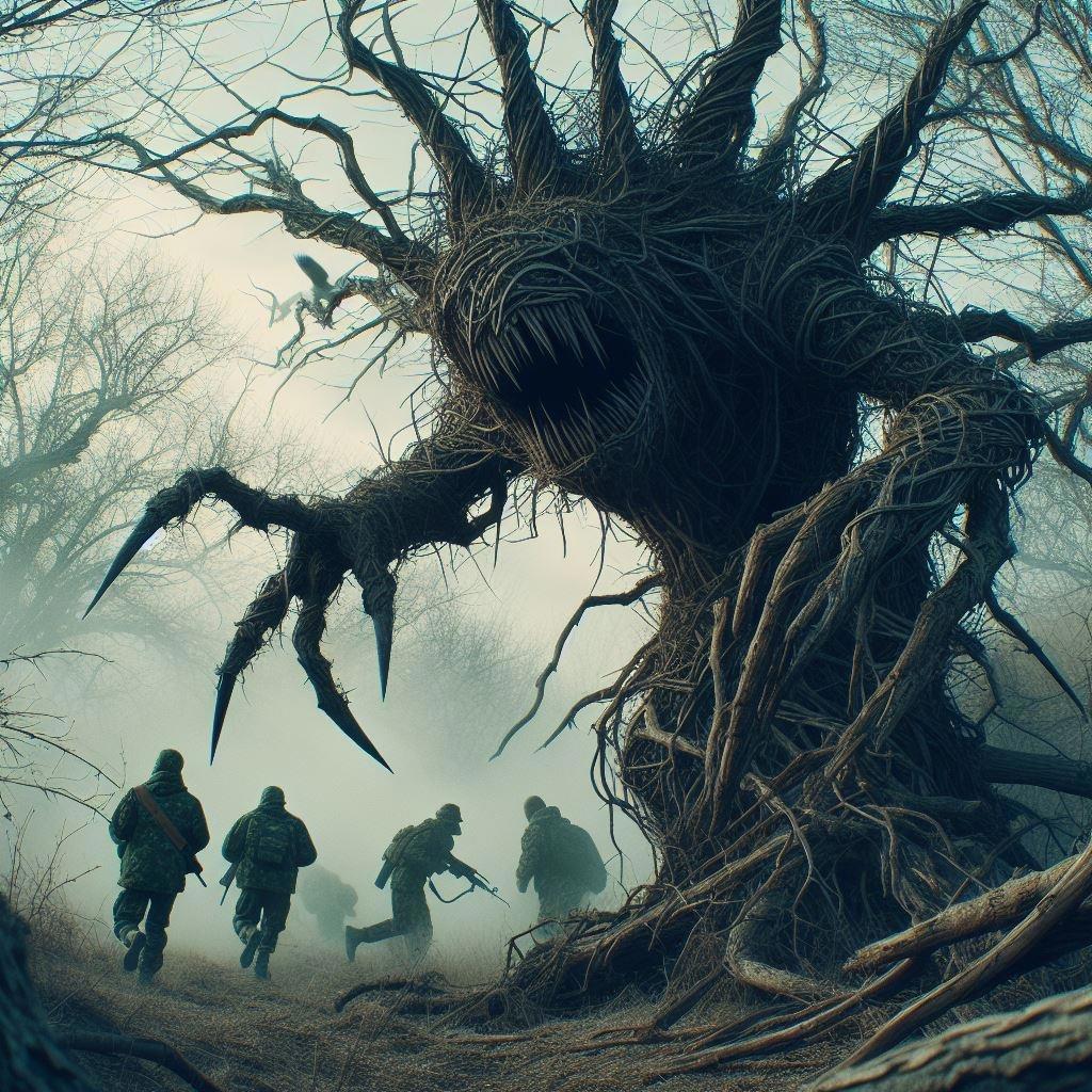 Стрельба раздавалась отовсюду, в туманном далеке что-то взрывалось, мелькали крупные тени и не только наземные. Вот крикнула крупная летающая тварь, к ней метнулся дымный росчерк, взрыв осветил несколько сотен метров и картина меня не порадовала. Свинцово-серое небо над постапокалиптическим лесом, воздух настолько пыльный и густой, хоть топор вешай.