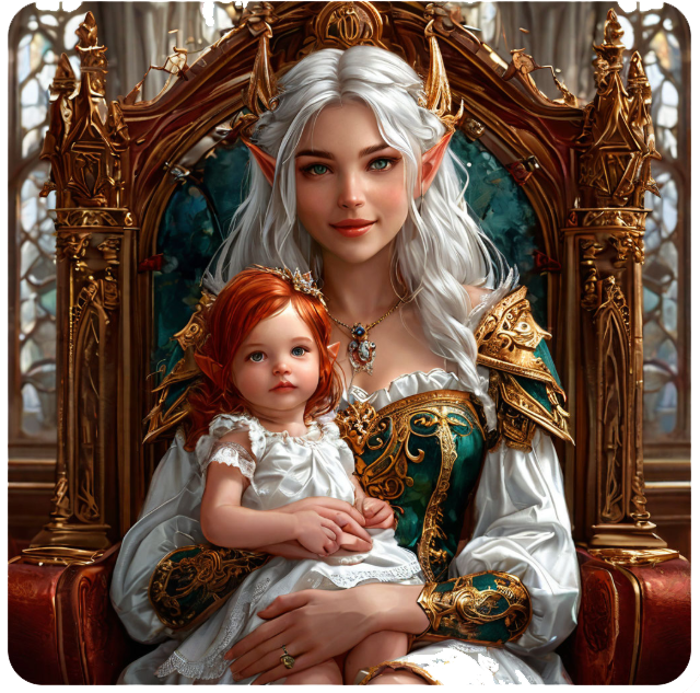 В главной зале дворца, куда сквозь многочисленные окна и стеклянные купола проникал солнечный свет, собрался весь цвет эльфийского народа. На помосте стояло два величавых трона, но один из них пустовал – златокудрый и статный Князь Эрлиро́н, не в силах усидеть на месте, расхаживал среди своих подданных, касался их рук и принимал поздравления. Княгиня Зитаэ́ль с дочерью на руках, счастливая и утомленная, грациозно восседала на троне. Но все внимание ее было поглощено ребенком, маленькими глазками, ручками и ножками.