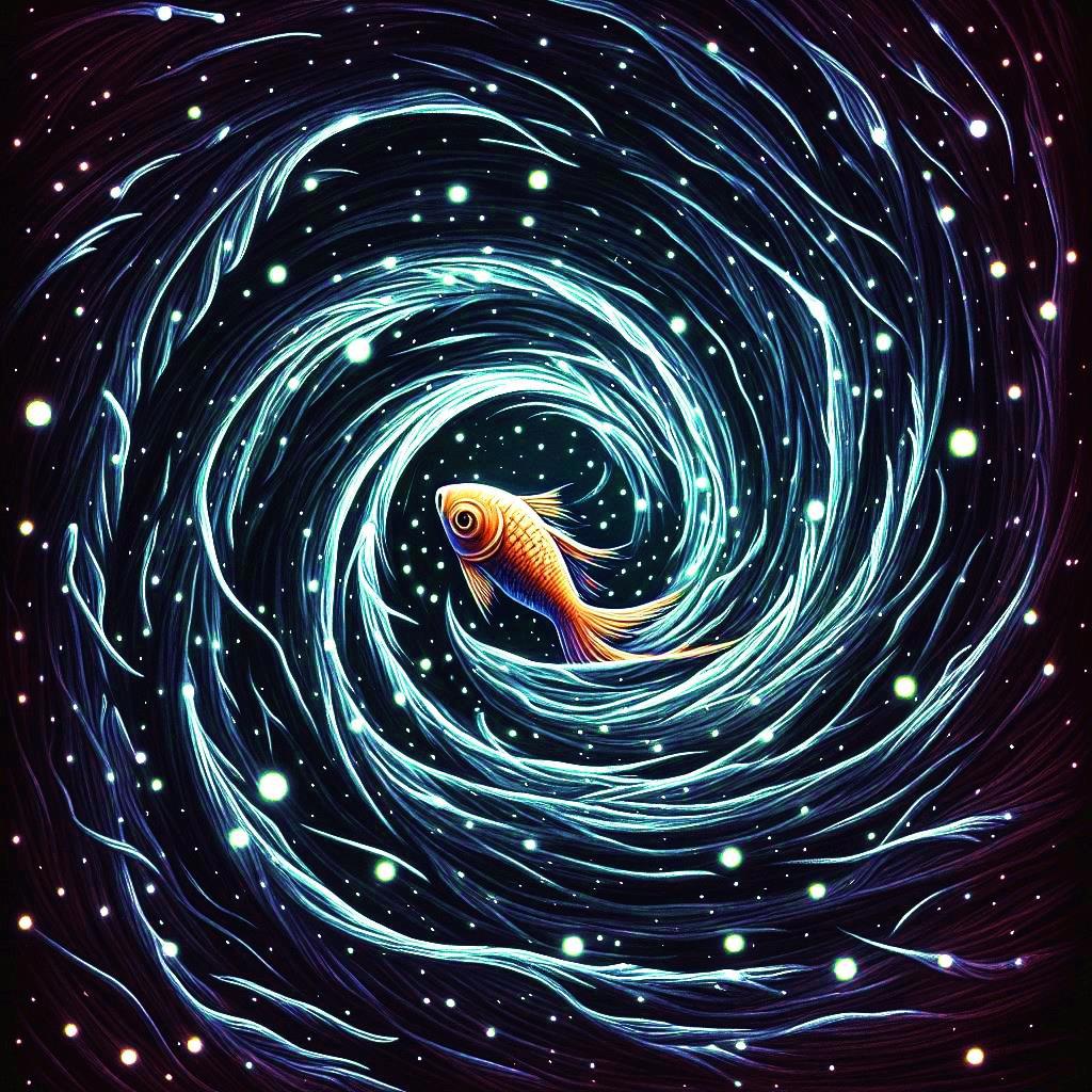 Рыбка оказалась в водовороте светового потока. Он закружил её, словно невидимый вихрь космоса, и каждый раз, когда она пыталась вырваться, поток затягивал её обратно.