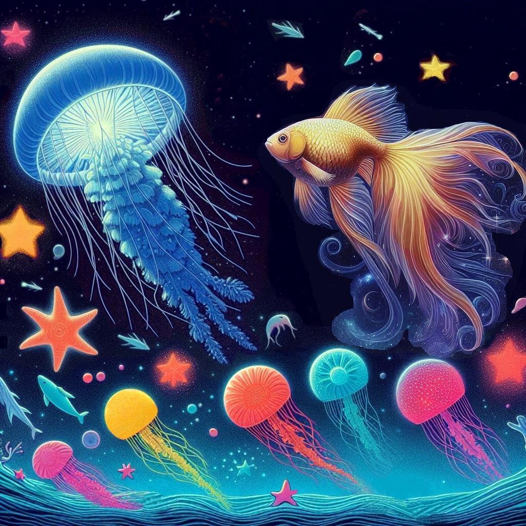 Рыбка кивнула и, войдя в круг медуз, начала двигаться, повторяя их плавные движения. Она кружилась, чувствуя, как музыка заполняет пространство, и каждое её движение становится частью волшебного танца. Рыбка ощущала себя словно в другом мире, где звёзды и медузы танцуют в вечной гармонии. Свет медуз мягко переливался вокруг неё, словно волны моря, и на мгновение ей показалось, что она нашла свою звезду среди этих мерцающих огней и танцевала с ней вальс.
