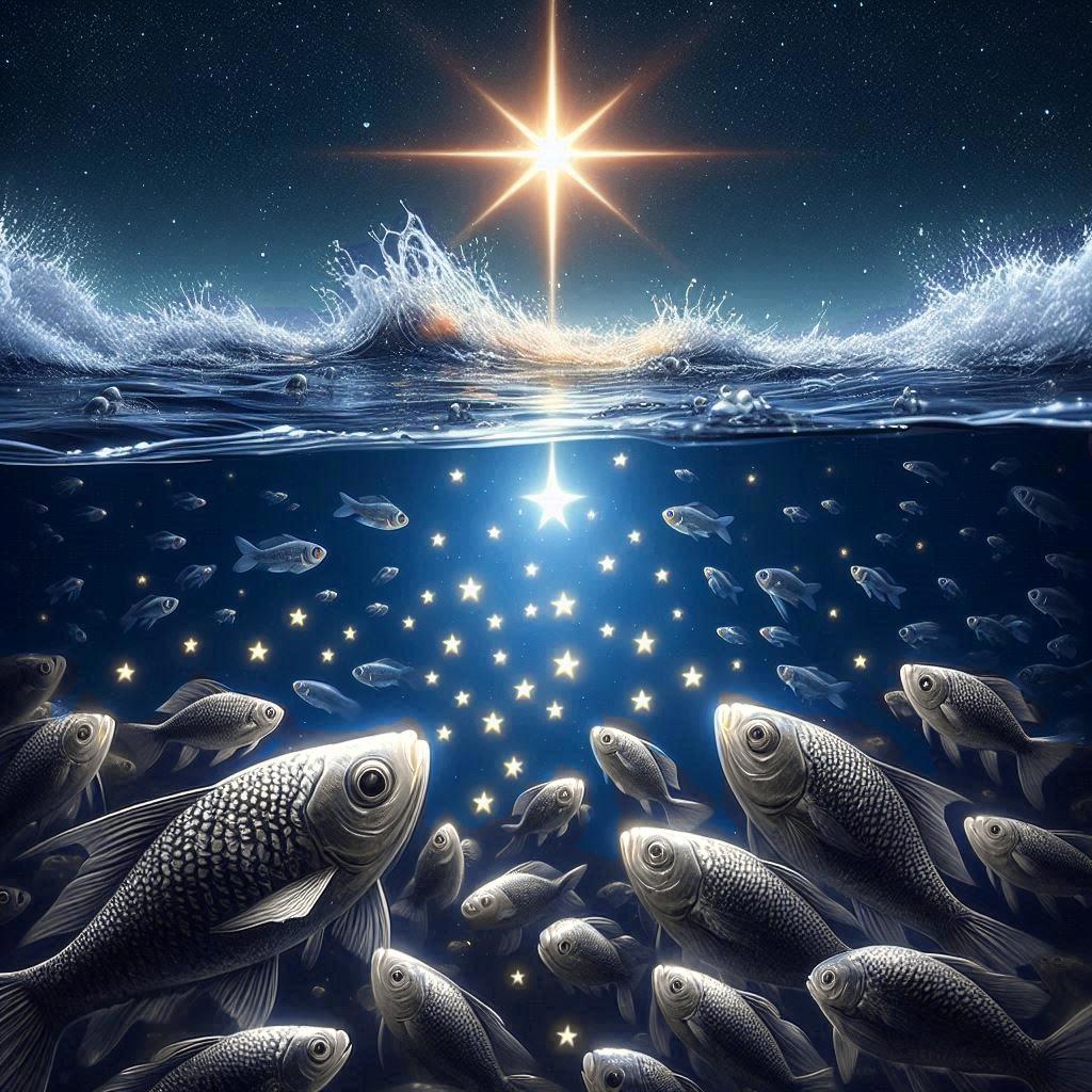 Рыбка плыла среди бесконечных потоков света, чувствуя, как её сердце с каждым движением бьётся всё сильнее. Звезда, яркая и манящая вперёд, стала её путеводной нитью.