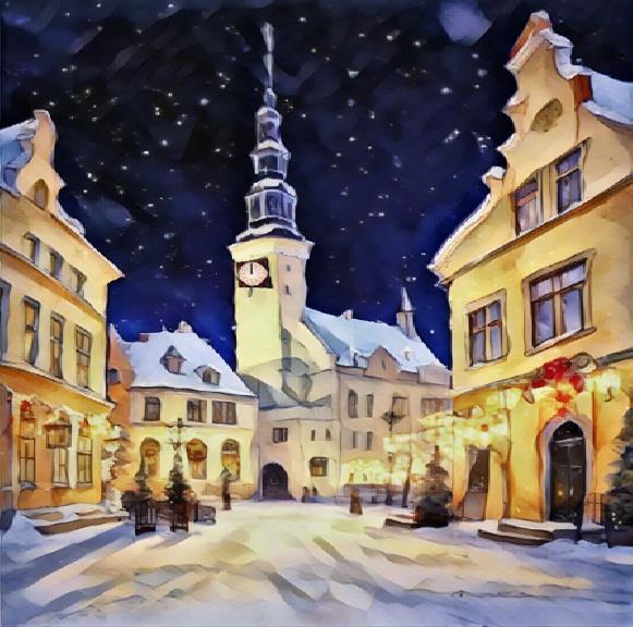 Дети после работы не пошли спать , а отправились на центральную площадь , где возвышалась ратуша с башней под остроконечной крышей . На башне видны были часы . Стрелки их показывали без одной минуты двенадцать , почти полночь , самый канун Рождества . Минутная стрелка дрогнула , и подползла к следующей черте . Но вместо боя курантов , вместо торжественного удара колокола внутри механизма , из стрельчатых окон башни вырвался какой-то обрывок звука . Не мелодичный перезвон , а его повторяющийся обломок : три нисходящие , плачущие ноты на расстроенном клавесине , повторённые раз , другой , третий… Они все лились однообразно , как капли с сосулек , и , детям , особенно Эмили , показалось , будто именно этот звуковой обрубок и закручивал сейчас весь город в его временную петлю .