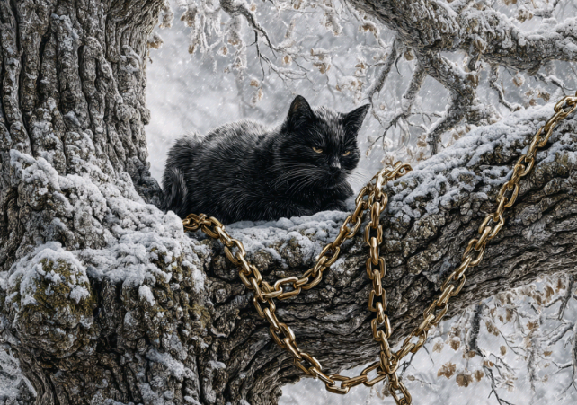 И вы ещё спрашиваете, почему у меня такой зловещий вид? Таки сами попробуйте зимой на цепи посидеть, пусть даже и на златой. И ведь не спрячешься никуда. Единственное дупло на дубе - и то занято. Там уже русалка квартирует и фиг кого она к себе пустит. А тем более меня. Хвостатая с чего-то решила, что я с голодухи её за рыбку приму, да и съём, как только подходящий момент настанет. Ну не дура ли, а?