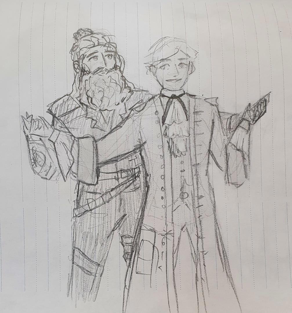 На этом рисунке современной художницы Маринетт Мортем изображены персонажи сериала “Our Flag Means Death” - Эд и стюарт Стид, в забавной сцене на пиратском корабле. Этот быстрый рисунок, запечатлевший персонажей фильма, был сделан в 2022 году. На нем изображены капитан Эд и стюарт Стид - два персонажа из сериала “Наш флаг означает смерть”.