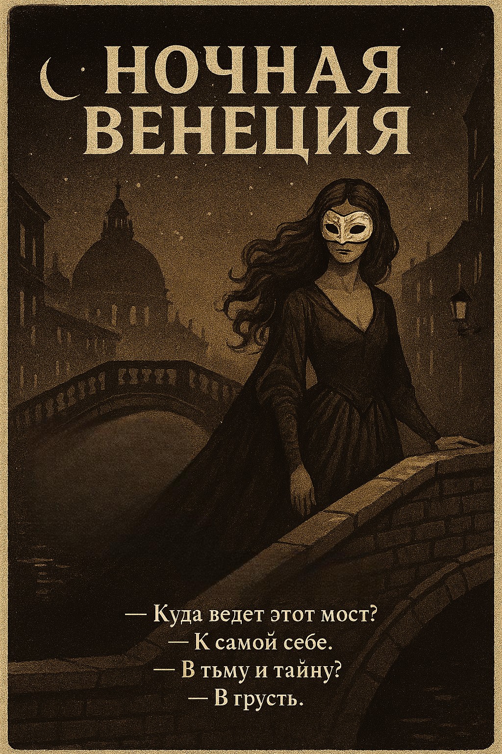 Ночная Венеция – это зеркало, в котором отражаются не только дома, но и души... Город дышит туманом и водой. Каналы шепчут свои тайные истории, а дворцы, словно старые актёры, спрятали лица под масками теней. Лёгкая грусть витает в воздухе, как запах свечного воска, и кажется, что каждый шаг по мостовой открывает дверь в прошлое....