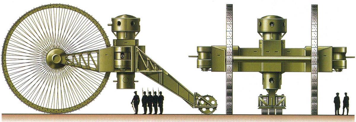 В своём техническом безумии Хезрингтон был совсем не одинок. Сэр Уильям Триттон пришёл к своему «маленькому Вилли» отнюдь не сразу. В его активе имелись проекты огромных колёсных боевых машин. Один из них имел 15 м в длину, второй — 11 м. Ещё один, безымянный проект 1915 года, и вовсе поражает воображение: длина трёхколесной боевой машины составляла 27 м, ширина — 15 м, высота — 12 м. Её главным отличием от схожих проектов было то, что конструкционным материалом была не сталь, а бетон. Сколько при этом весил железобетонный монстр, можно лишь догадываться. При этом всё его вооружение состояло из 6-фунтовой пушки и зенитного пулемёта