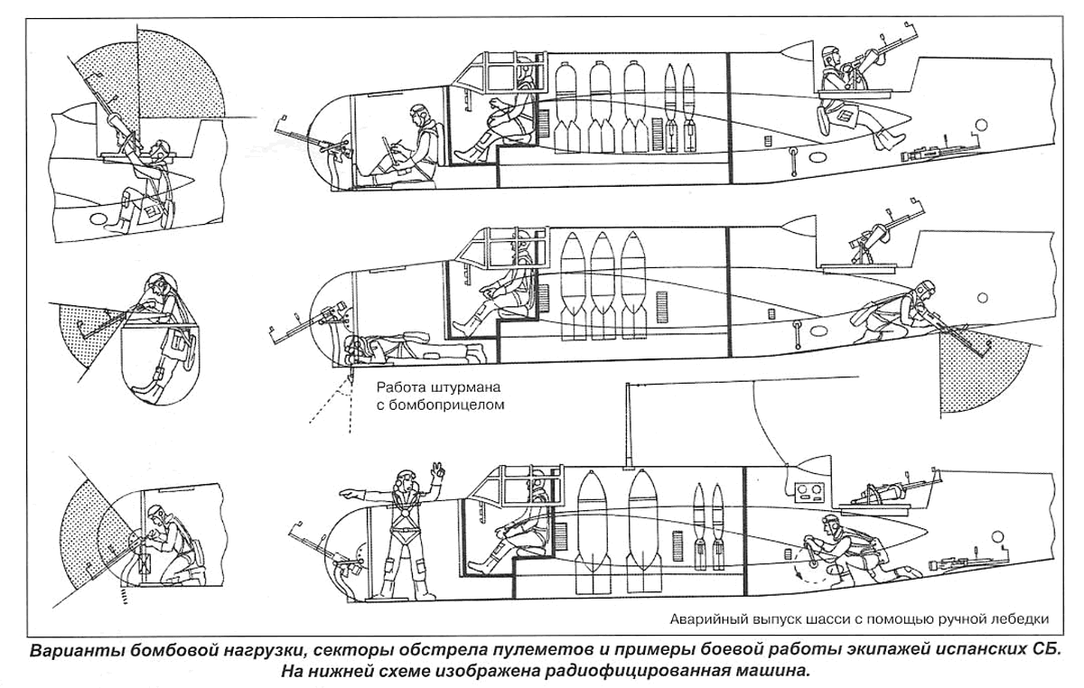 Эта картинка называется "варианты бомбовой загрузки испанских СБ". Но я бы отметил на ней прежде всего ужасные условия работы экипажа, и особенно пилота: спинка пилотского кресла установлена вертикально и упирается в переборку бомбоотсека. И в этом состоянии пилоту приходилось работать часами. Штурману, впрчем, тоже не позавидуешь.