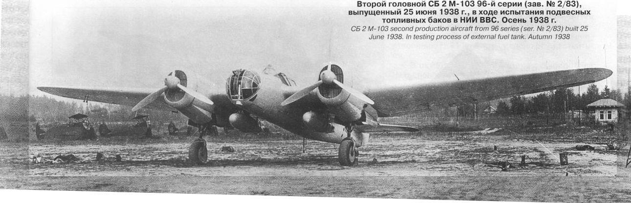 СБ-2М-103 в ходе испытаний подвесных топливных бвков; осень 1938-го.