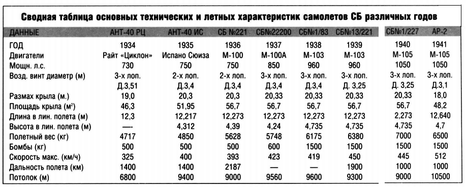 Что в этой таблице не так? Да в ней всё не так! Напр, мощность моторов самолётов АНТ-40РЦ, АНТ-40ИС и СБ Но 221 приводятся номинальная, а затем, для всех остальных модификаций, максимальная. С дальностью полёта тоже... серьёзное враньё, как и с потолком: потолок для всех типов, кроме АНТ-40РЦ, приведён "рекордный", в то время как реальный, рабочий, "практический", потолок у всех этих модификаций (кроме, возможно, Ар-2) --- 7 800м. (Что очень и очень неплохо для того времени).