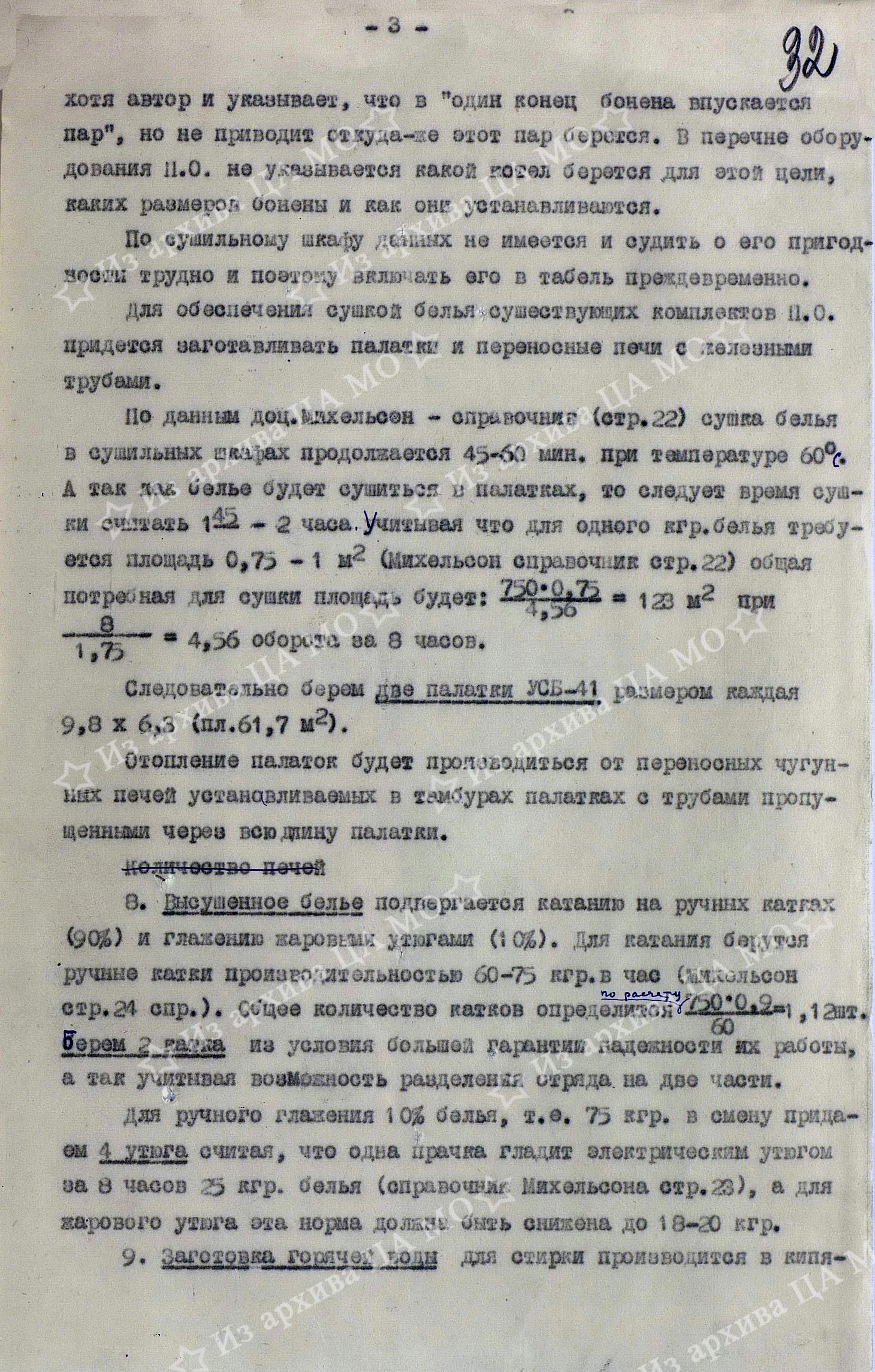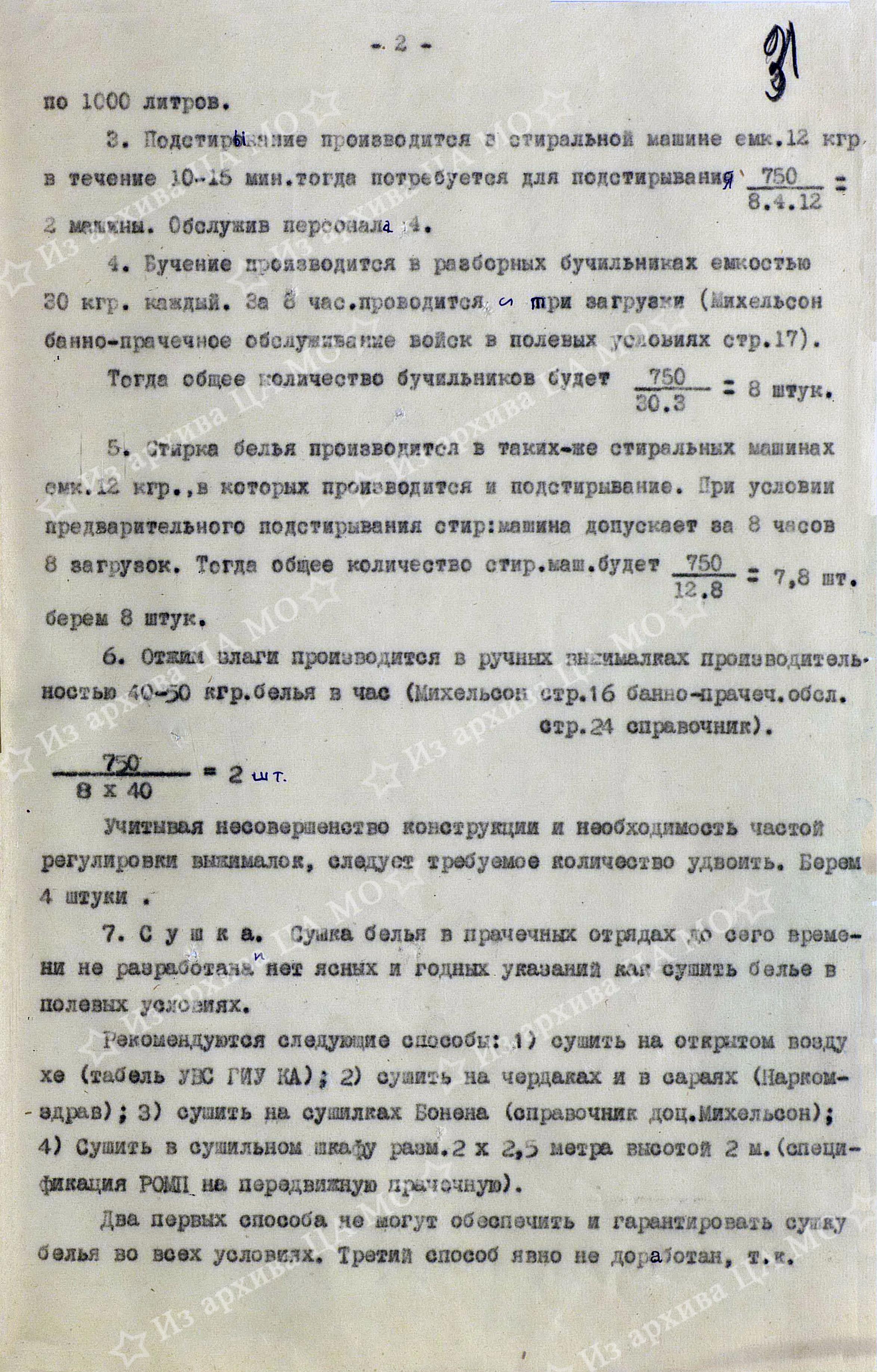 Как можно увидеть, отряд обеспечен аж восемью стиральными машинами, и работает на них восемь человек (в соответствии с расчётами 1940 года, две машины для замачивания и работники, их обслуживающие, входят в общую численность). Несложно посчитать минимальную нагрузку на каждую прачку, занимавшуюся замочкой и подстирыванием: 375 кг. на каждую работницу в смену. Та же нагрузка приходится и на девушек, занимавшихся глажением, катанием белья, отжимом и бучением. У девушек – прачек норма выработки меньше – 94 кг на человека в смену. Почему так мало? А стиральные машины были крайне ненадёжными, а норму прчо никто не снижал, так что, пока машины ремонтировались, стирали девушки руками, в корытах, известных многим с детства, и с использованием замечательного приспособления – стиральных досок (вполне может быть, что и их вы видели в свои детские годы). Почему при расчётах написано, что норма минимальная? Потому, что фронт ждать не будет, а обеспечить госпиталя, воинские части, выведенные на отдых и других получателей свежего, выстиранного и поглаженного белья, необходимо было крайне срочно, заявки и требования увеличить объемы шли постоянно. И тут уже не до соблюдения трудового законодательства, норм выработки и других условностей мирного времени. К тому же зарплата начислялась в зависимости от обработанного, сделал больше – соответственно и выплаты увеличиваются. Об изменении норм или «уравниловке», как это стало принято при хрущёве и его последователях, речь не шла, и, как бы ни удивлялись некоторые, но учёт и контроль был поставлен неплохо. Возможно, могли быть и приписки, но: а) подтверждения этому не нашёл; и б) такие приписки не смогли бы существовать в больших объёмах, а тем более долго, всё же прифронтовая зона, да и работа такая, что вся на виду.