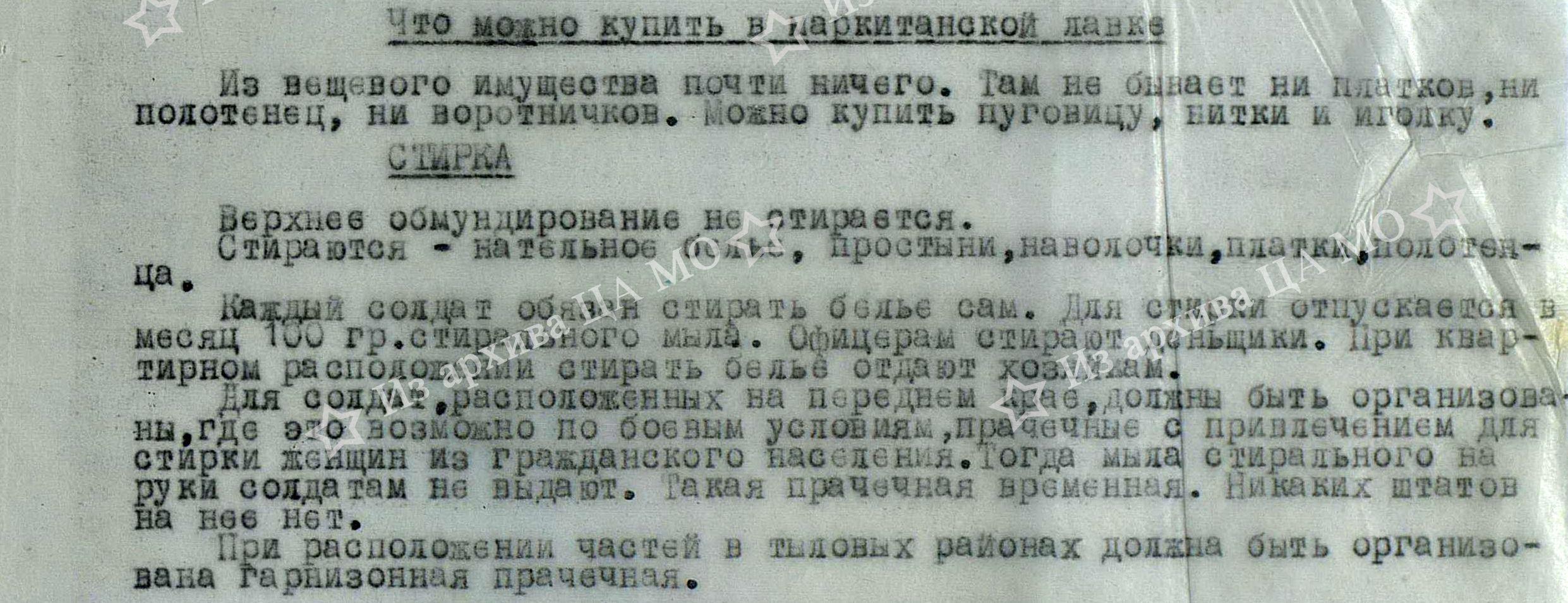 Название разработанного ГИнтУ документа говорит само за себя. Так вот, помимо всего ранее перечисленного, включая взрывчатые вещества, вполне естественно, что такая одежда была насквозь пропитана трупным запахом, а избавиться от него - задача сверхтрудная. Как-то читал, что такое обмундирование и бельё, на какое-то время закапывали в землю, покрывая толстым слоем грунта, вроде такая мера избавляла от тяжёлого запаха. Ведь выдать бойцу обмундирование или бельё, от которого просто разит смертью, задача не из лёгких, и тут уж приметы и суеверия проявятся в полный рост. А боец будет прав, отказавшись от такого имущества. Так что, от работы прачек зависело многое. Особенно в условиях хронической недопоставки вещевого имущества от предприятий. Да даже изготовленное не всегда удавалось сразу направить в войска, обмундирование никогда не входило в перечень предметов, поставляемых в приоритетном порядке.
