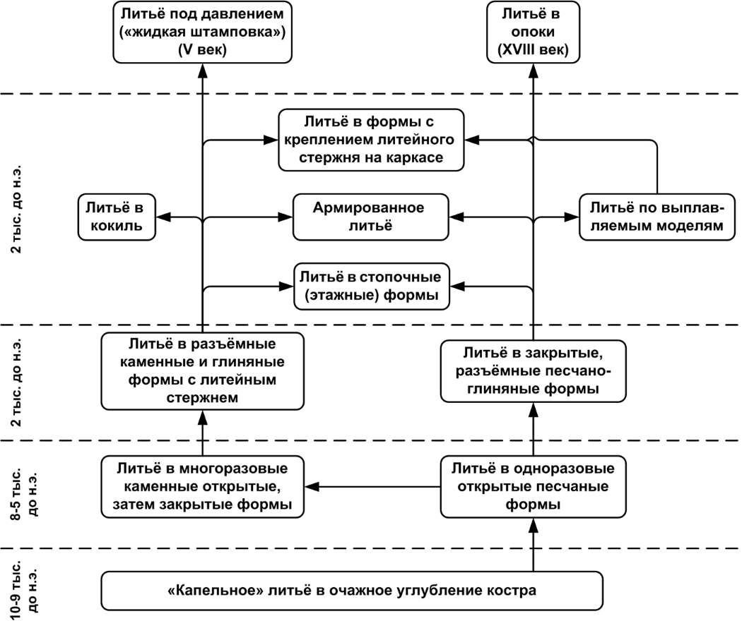 Сначала применяли литье в открытые глиняные или песчаные формы. Их сменили открытые формы, вырезанные из камня, и формы, у которых углубление для отливаемого предмета находилось в одной створке, а другая, плоская, играла роль крышки. Следующим шагом стало изобретение разъемных форм и закрытых форм для фигурного литья. В последнем случае сначала из воска лепили точную модель будущего изделия, затем ее обмазывали глиной и обжигали в печи. Воск плавился, а глина принимала точный слепок модели и использовалась в качестве литейной формы. Этот способ получил название литья по восковой модели. Мастера получили возможность отливать пустотелые предметы очень сложной формы. Для образования полости практиковалась вставка в формы особых глиняных сердечников – литейных стержней. Несколько позднее были изобретены технологии литья в стопочные формы, в кокиль, в различные формы с креплением литейного стержня на каркасе, литье по выплавляемым моделям и армированное литье.