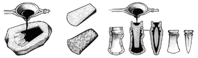 Эпоха металлов наступила тогда, когда повсеместно была освоена технология изготовления литых топоров и мечей. Необходимость объединить в одном орудии труда каменное рубило и деревянную палицу возникла у человека уже в каменном веке. Первые бронзовые топоры, изготовленные методом литья, повторяли форму каменных, однако новые требования к орудиям труда и необычные в сравнении с камнем свойства бронзы способствовали быстрому совершенствованию литых изделий. Появились топоры сложных форм, с закраинами, вислообушные, кельты. Их изготовление требовало высокого развития литейного ремесла: сложная конфигурация отливки и наличие отверстия значительно усложняли устройство разъемных каменных форм. Появление усовершенствованных литых бронзовых топоров сыграло исключительную роль в развитии многих народов: облегчило строительство жилищ и изготовление других орудий труда и предметов быта, упростило освоение лесистых местностей земледельцами и т. п. Литые мечи и кинжалы раньше других бронзовых изделий стали произведениями искусства. Древние мечи, найденные при археологических раскопках, часто снабжены не только замысловатыми рукоятями с литыми узорами, но и богатой инкрустацией из серебра, золота и драгоценных камней.