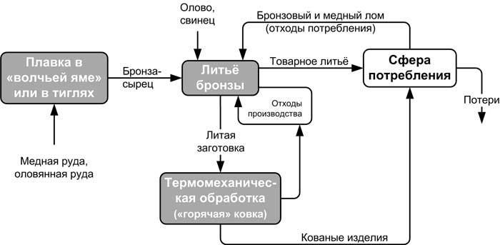 Главными металлургическими технологиями были литейные: искусство обработки жидкого металла позволяло получать уникальные бронзовые изделия и бытовые предметы. Именно в эту эпоху появились вещи, сопровождающие человека в его повседневном существовании, и инструменты, являющиеся символами основных технических профессий. Это время получило название бронзового века.