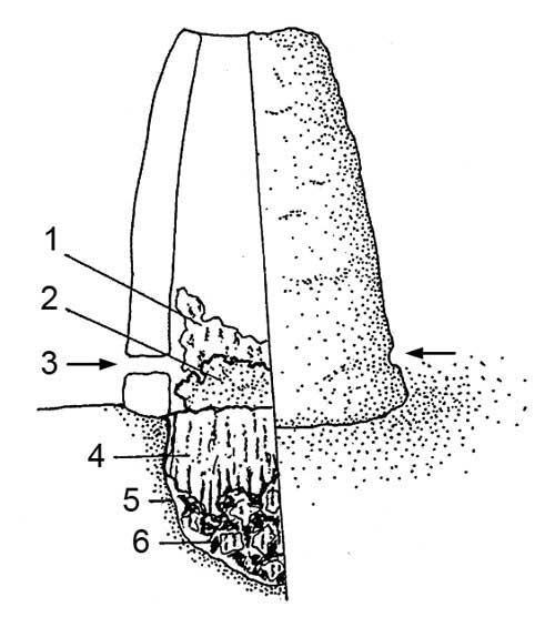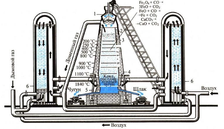 1- загрузочное устройство, 2 — колошник, 3 — шахта, 4 — распар, 5 — горн, 6 — регенератор