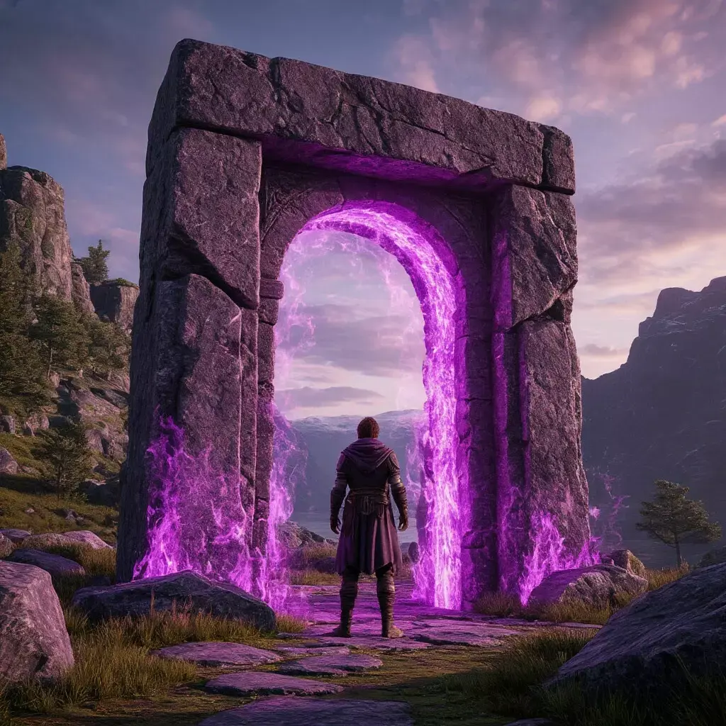 - "Как же хорошо что я любопытный , мне прям спать ну вообще не хотелось" - подумал я иронично ругаясь что позволил чувствам овладеть собой . Одевшись потеплей и направившись на свет , в голову лезли разные теории . Желание было только одно : узнать и быстро уходить оттуда . Трусом назвать меня было сложно , просто проблем больше не хотелось решать , жить мирно и создать семью . И вот спустя 40 минут ходьбы я увидел перед собой камень , в его полости был портал сиреневого цвета . Он издавал непонятные звуки словно кто то стучал по бокалам и при этом это было где то в пещере . Гулкое эхо и трель звучали и расплывались в тишине как волны по песчаной глади .
