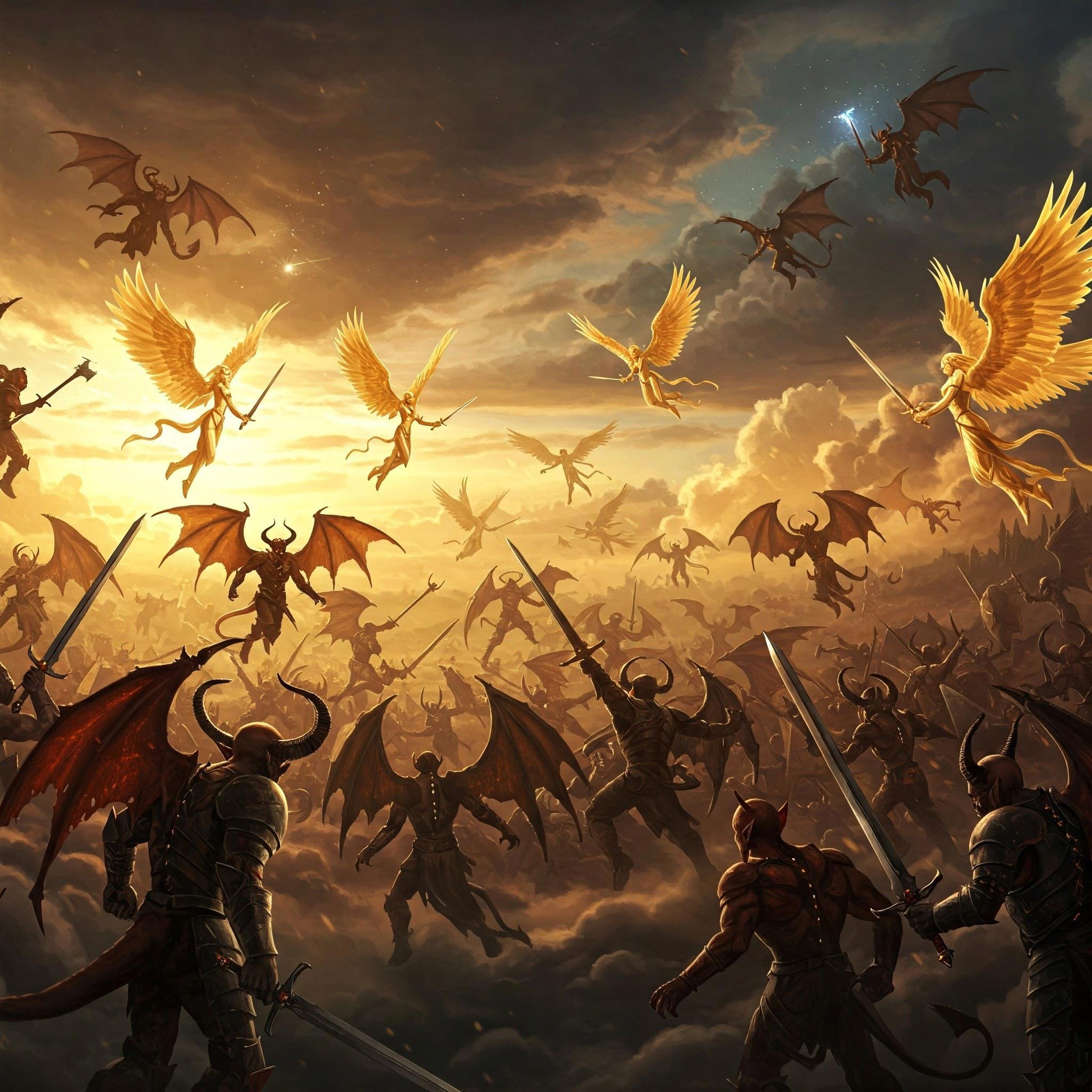 И произошла на небе война: Михаил и Ангелы его воевали против дракона, и дракон и ангелы его воевали против них, но не устояли, и не нашлось уже для них места на небе. И низвержен был великий дракон, древний змей, называемый дьяволом и сатаною, обольщающий всю вселенную, низвержен на землю, и ангелы его низвержены с ним. — Отк. 12:7