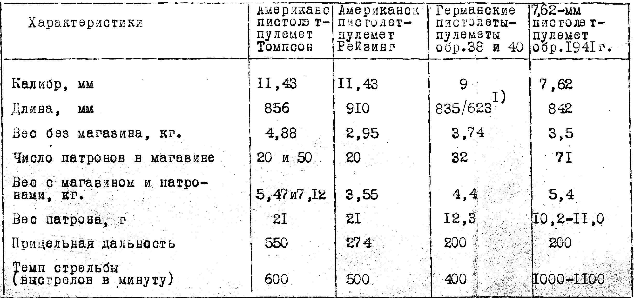 Ниже приводятся для сравнения основные данные американских пистолетов-пулеметов Томпсона и Рейзинга, германских пистолетов-пулеметов обр.38 и 40 г.г. и нашего 7,62мм пистолет-пулемета обр.1941 года.