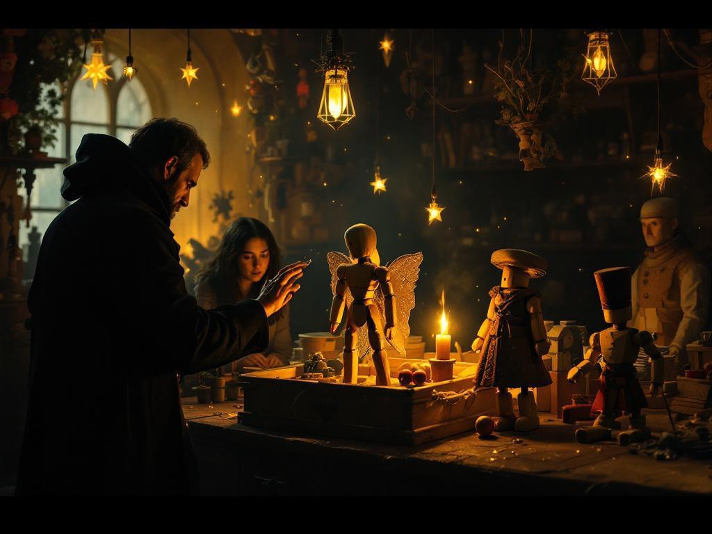В маленьком снежном городке, где фонари дрожали от ветра, а дома укутывались в пуховые одеяла снега, стояла старая игрушечная мастерская. Её окна тускло светились в сумерках, а над дверью висела выцветшая вывеска: "Егоровы чудеса". Внутри, среди стружек и запаха краски, дедушка Егор медленно шлифовал деревянную фигурку. Его руки дрожали, но глаза были полны тепла.