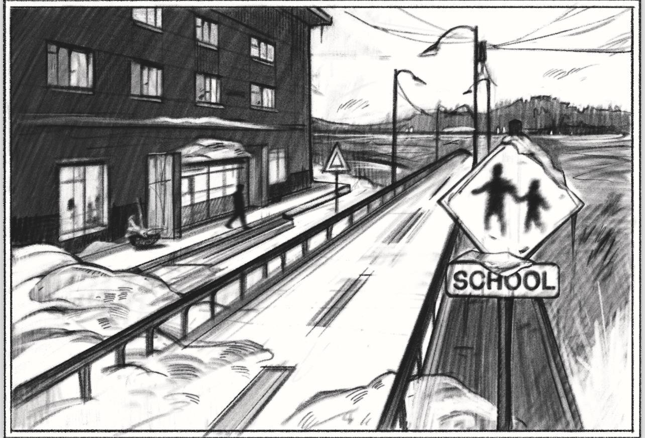 Ладно, пожалуй, продолжу. Как я уже сказал я вышел через центральную дверь, и в лицо мне сразу подул холодный ветер. Я посмотрел на школьный знак, который практически полностью занесло снегом, и на горы вдали.