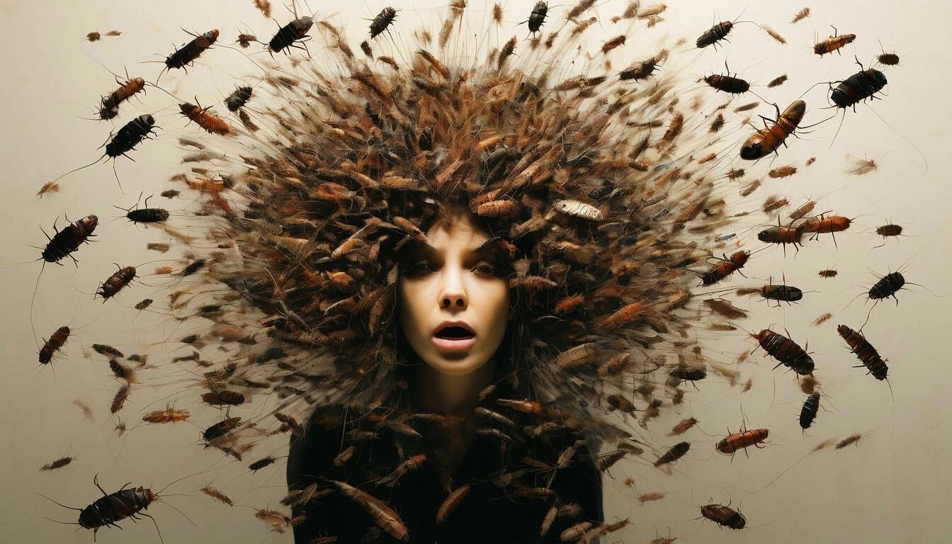 Олег встал, но тут же едва не упал назад на кровать. Перед глазами мелькали чёрные точки. Тряхнул головой, но точки никуда не исчезли — это были тараканы на стене. А ещё насекомые ползали по полу, по потолку и даже по нему самому. Взмахнув рукой, Олег сбросил нескольких тараканов вниз. Однако они были не только снаружи, но и внутри, он чувствовал, как они ползают под кожей. Но такое впечатление, что больше всего их находилось в голове.
