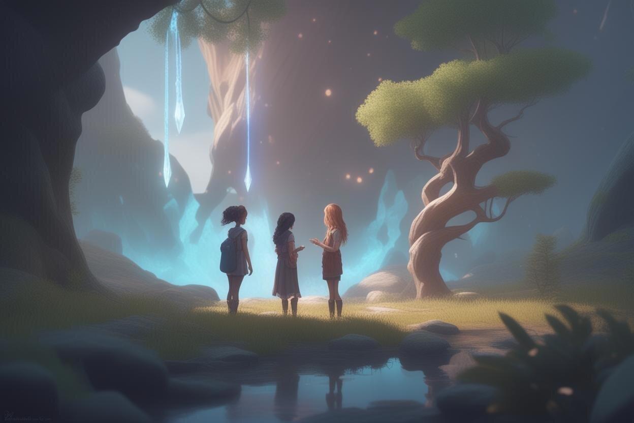 Трое друзей — Лира, Элин и Айра — стояли у входа в зачарованный лес. Перед ними возвышались светящиеся кристаллы, испускающие мягкий голубой свет. Лес казался одновременно манящим и пугающим: искривлённые деревья, словно древние стражи, охраняли его тайны.