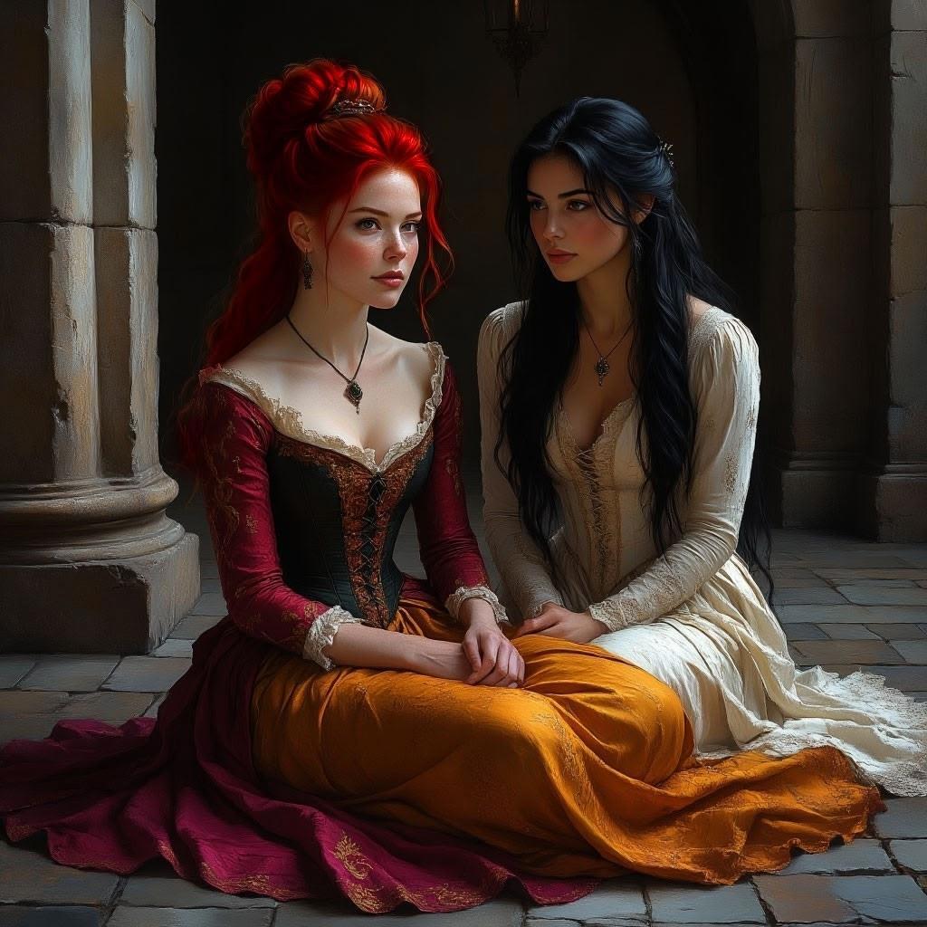 Она сидела на холодном каменном полу в полутемном храме, окруженная древними символами и статуями. Ее глаза блестели от слез, но в них читалась решимость.